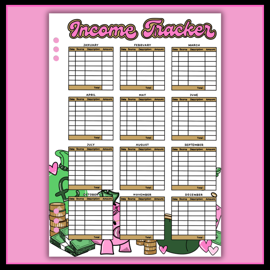 Looking to make some extra money? Keep track of all your incomes for the whole year using this single tracker page. From wages and tips to benefits and side hustles, jot down every source of income. By the end of the year, you'll have a full view of your earnings!