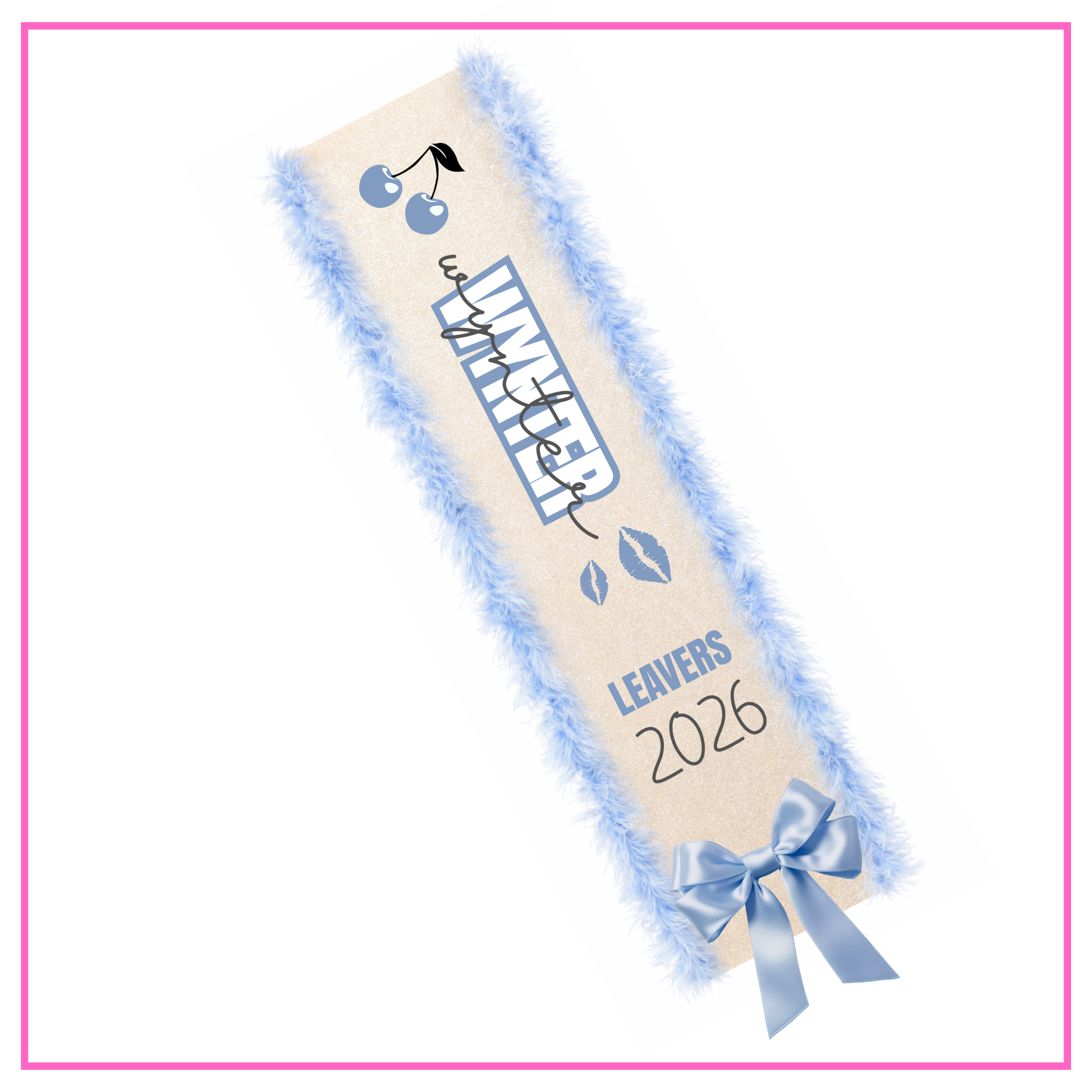 Design your dream sash by choosing your material, font, bow and feather colour for a look that’s perfectly you. Brand new for 2026, each sash features built-in LED lights with three different modes, adding sparkle, shine, and serious wow-factor to your leavers outfit.