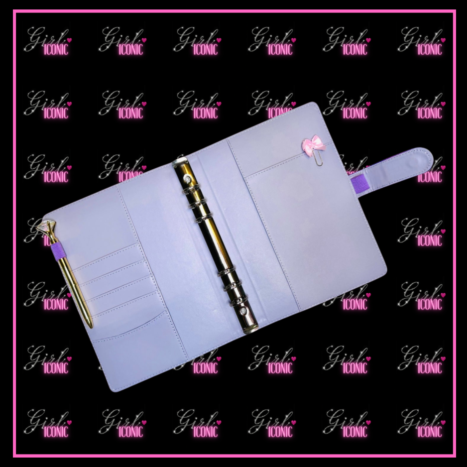 Luxury Lilac Planner Cover, featuring a magnetic closure tab, inside pockets and a 6 ring binder spine.